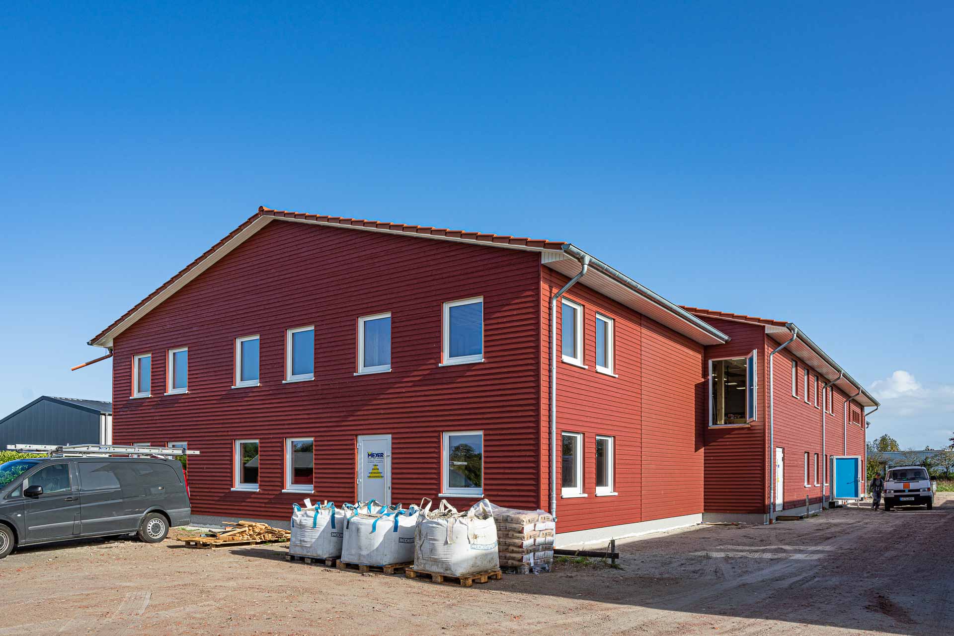 Die Veranstaltungshalle ist schon von Weitem gut sichtbar und besticht durch ihre Schweden-Optik mit der roten Holzfassade und den weißen Fenstern und Türen. Auch von Innen ist deutlich erkennbar, dass es sich um ein Holzgebäude handelt. Es war uns wichtig, dass unter Einhaltung des nötigen Brandschutzes möglichst viel Holz sichtbar bleibt. Das ist uns dank unseres Bauingenieurs „Holzbau Peer Janßen“ sehr schön gelungen.